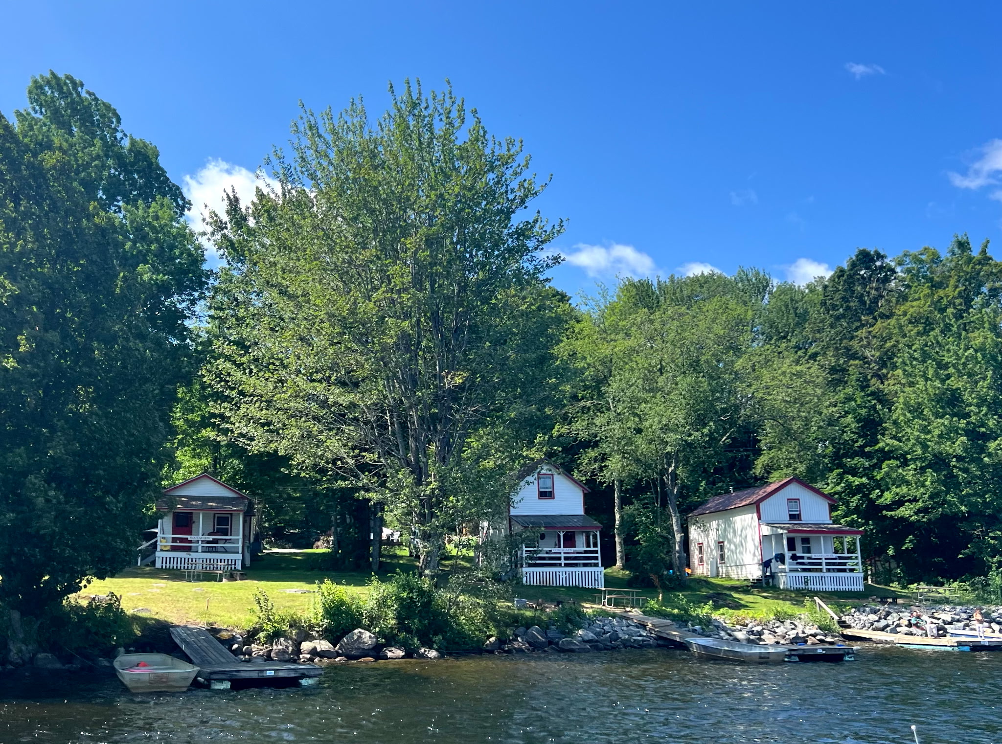 The views from the quiet porch are both lake and trees, offering some privacy from the lake side. The picnic area out front and fireplace is in a grassy yard, with plenty of room for fun.